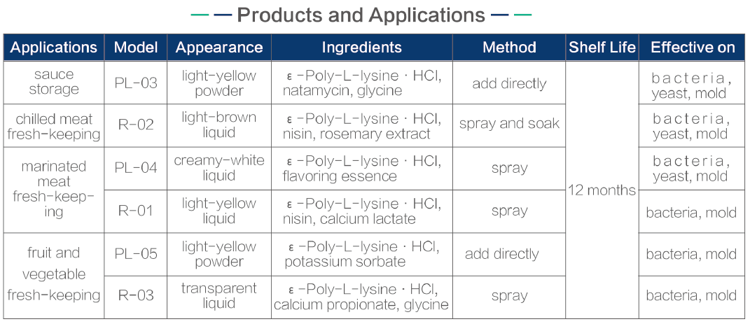 In addition to meat products, ε-Polylysine can be applied in fruits and vegetables, beans, rice and its products, wheat flour and its products, coarse grain products, condiments, beverages, cosmetics and daily chemical products.